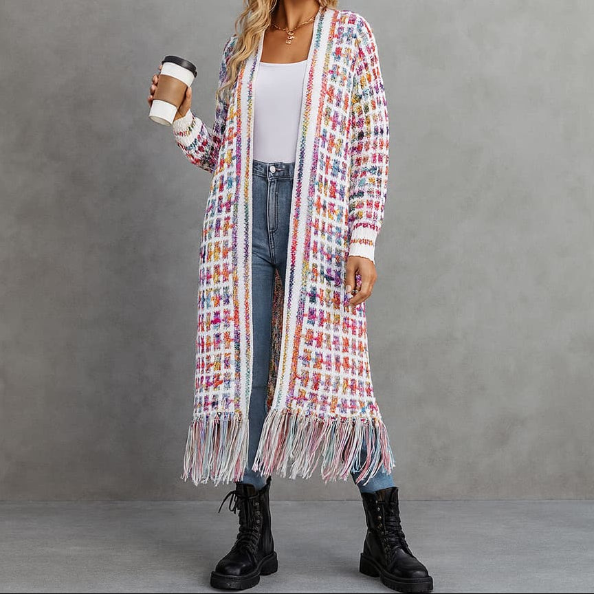 Handcrafted with a colorful woven texture, this long cardigan drapes effortlessly — soft, cozy, and timelessly stylish. The fringed hem adds a touch of playful sophistication, perfect for every mood and season.