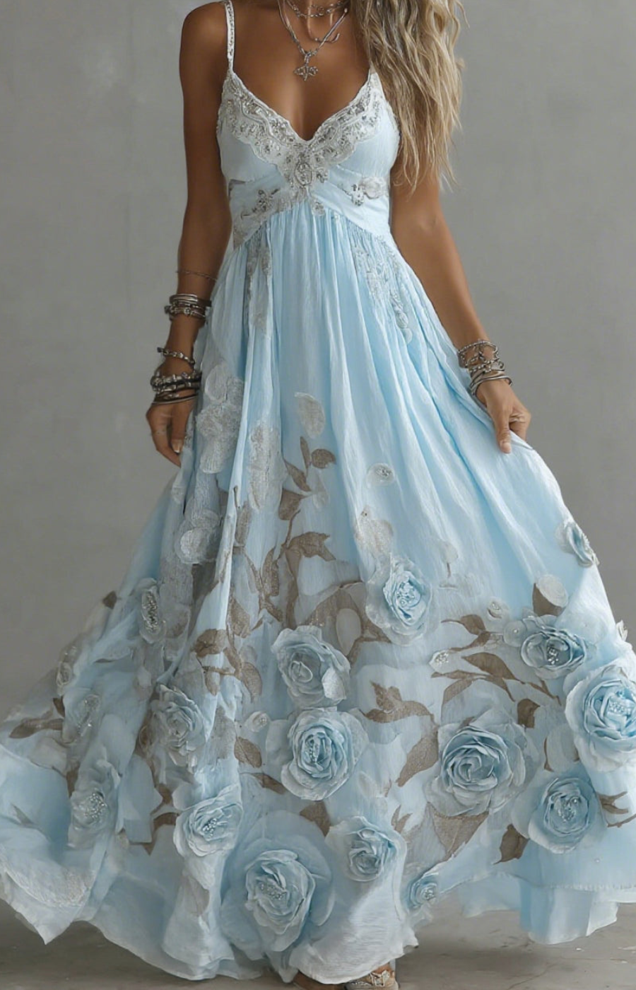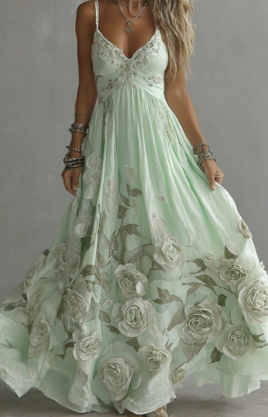 This long, flowing dress embraces the figure with softness, featuring delicate floral appliqués and refined embroidered details that elevate your look with an ethereal touch. The empire waistline gently elongates the silhouette, while the artisanal craftsmanship adds a sense of serene luxury that moves gracefully with you.