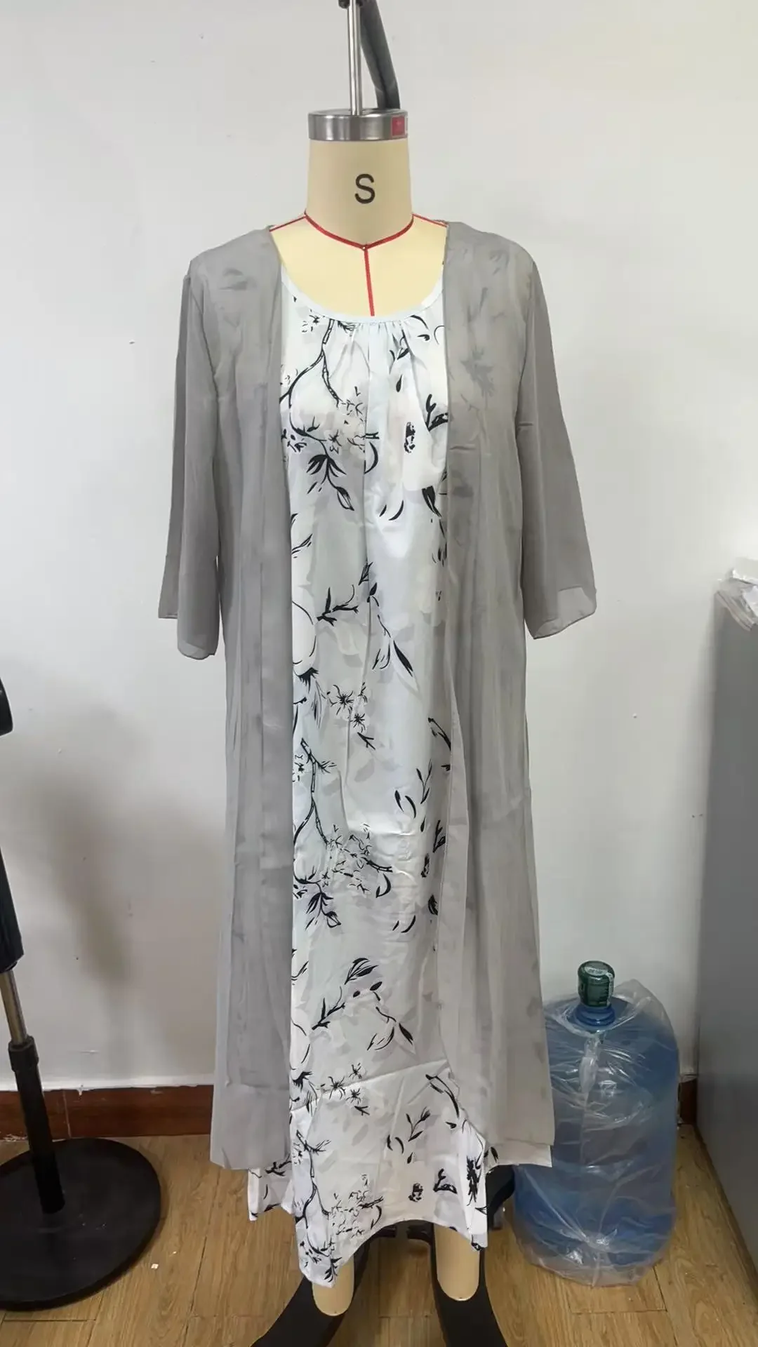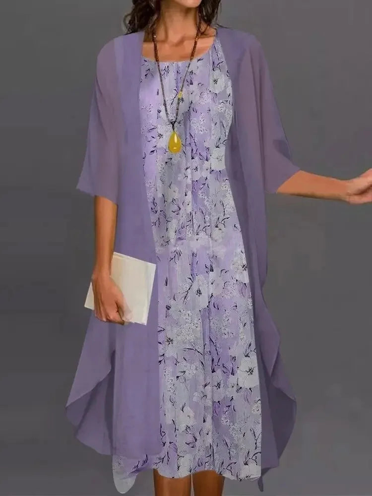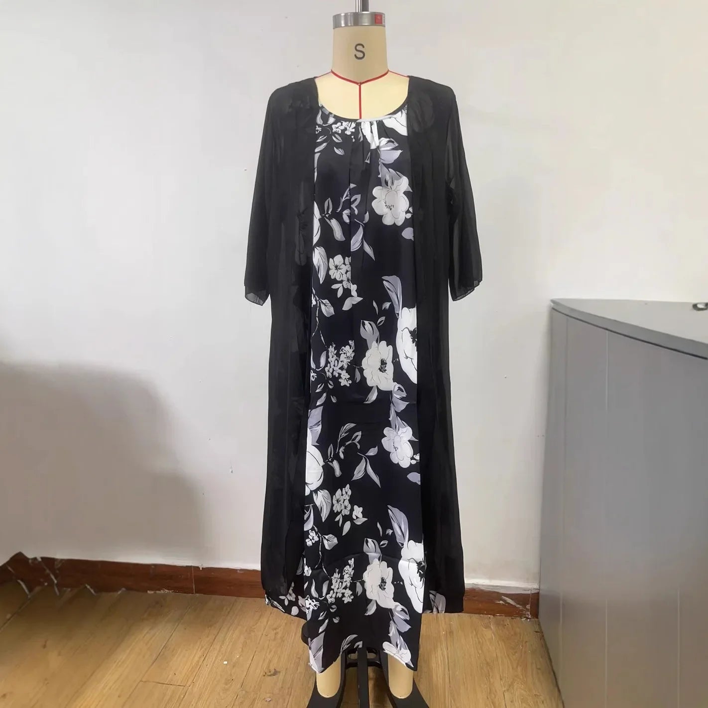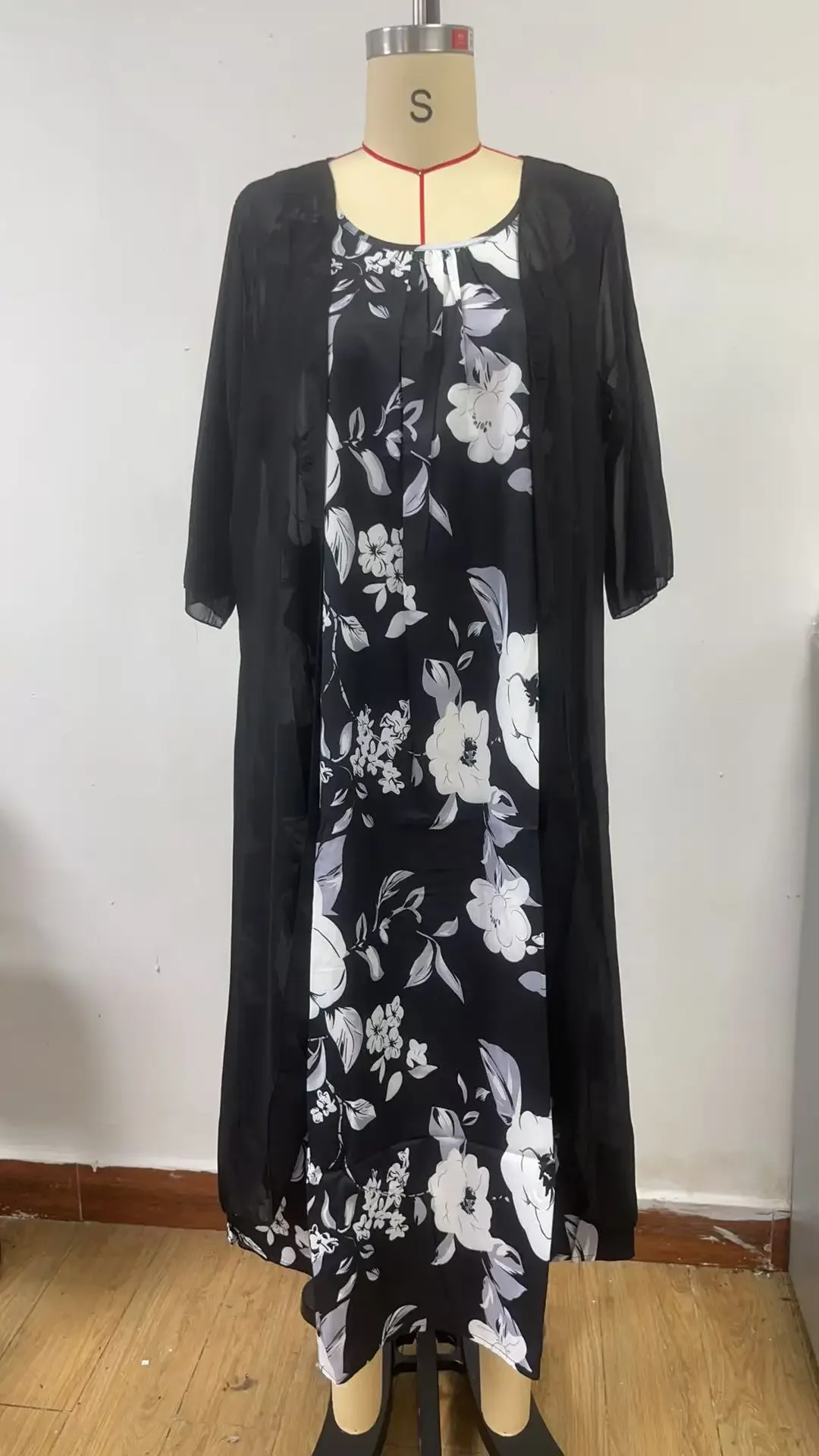 • التصميم الأنيق :يتميز هذا الفستان بتصميم أنيق بأكمام من سبع نقاط وسترة مطبوعة، مما يبرز الأناقة والرقي.
