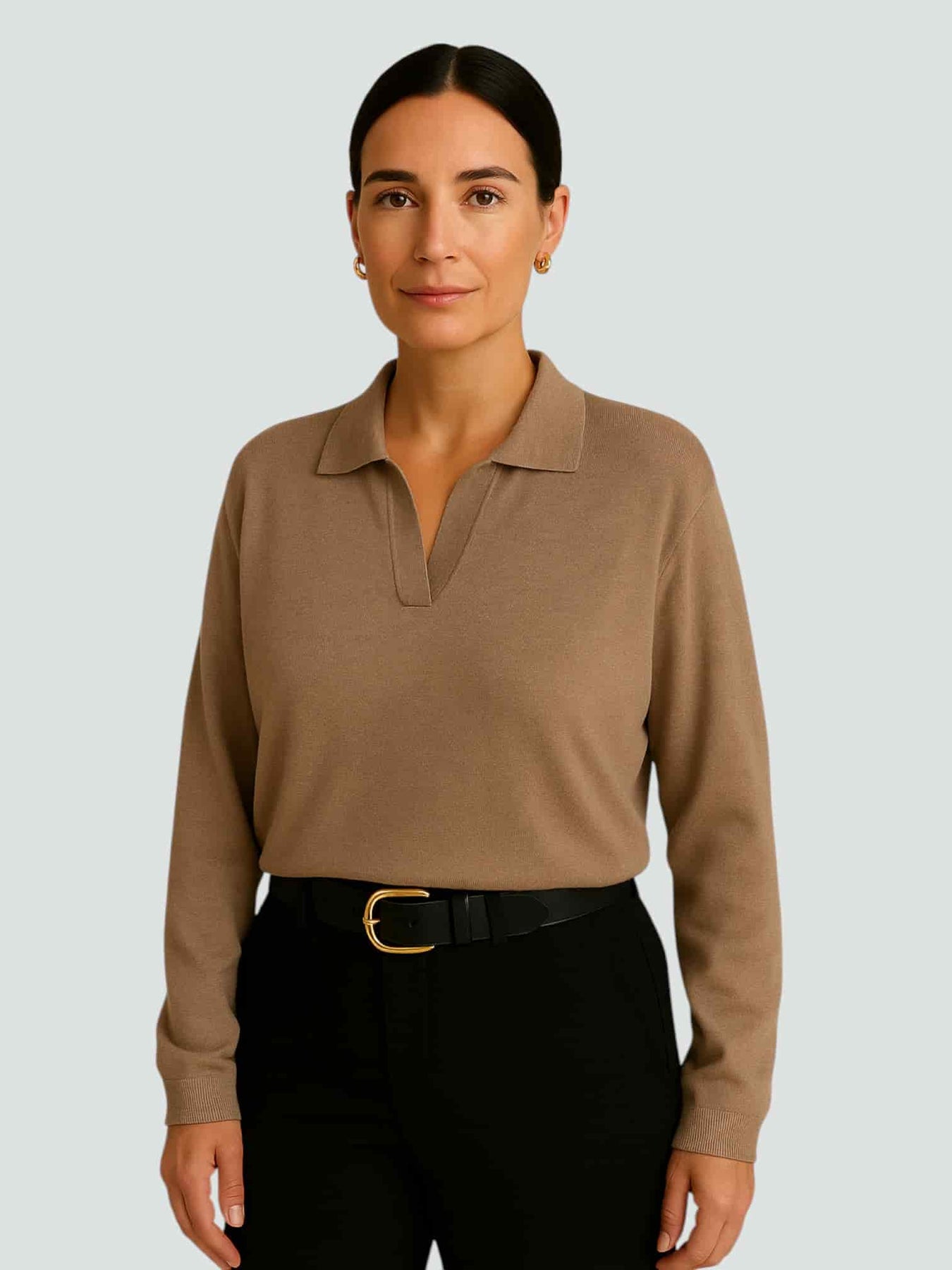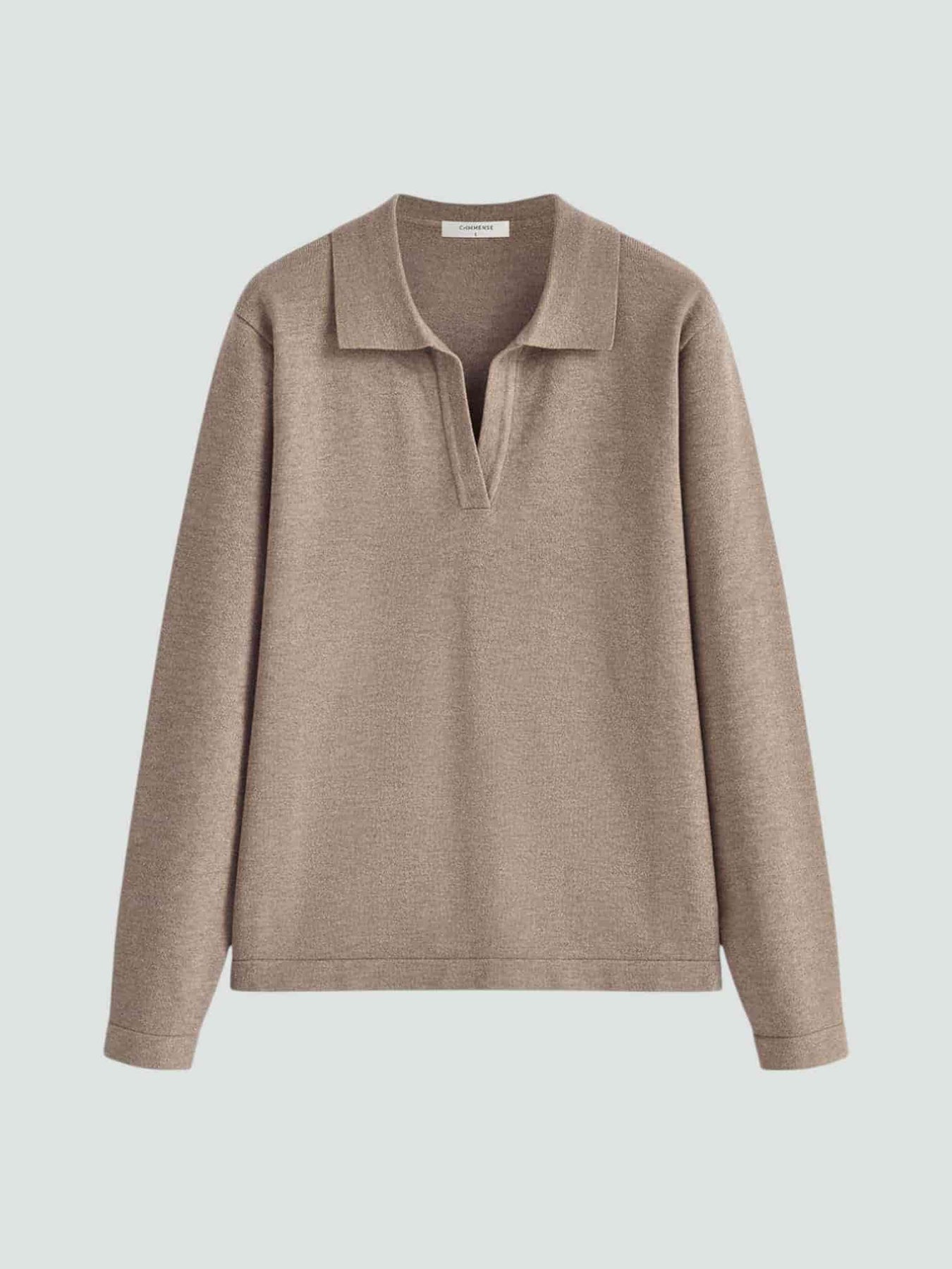 Un básico atemporal con un toque sofisticado. Este jersey de punto presenta un favorecedor escote abierto tipo polo y un corte relajado que se adapta con elegancia a tu silueta.