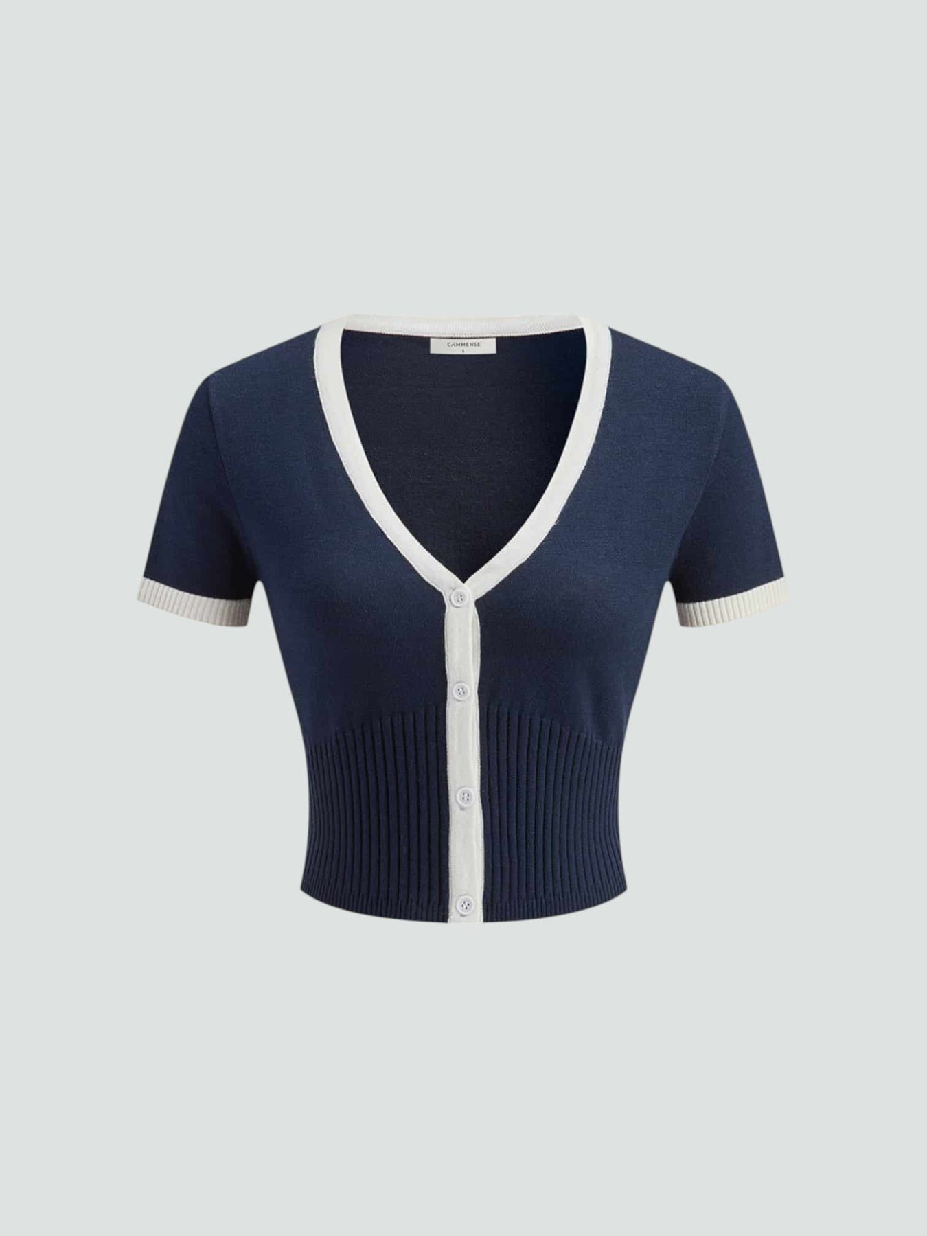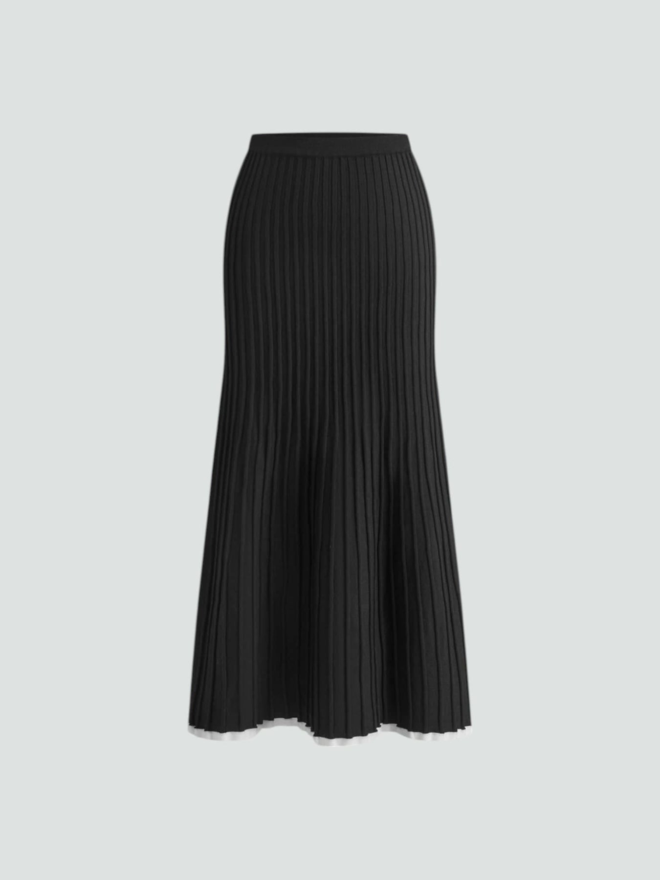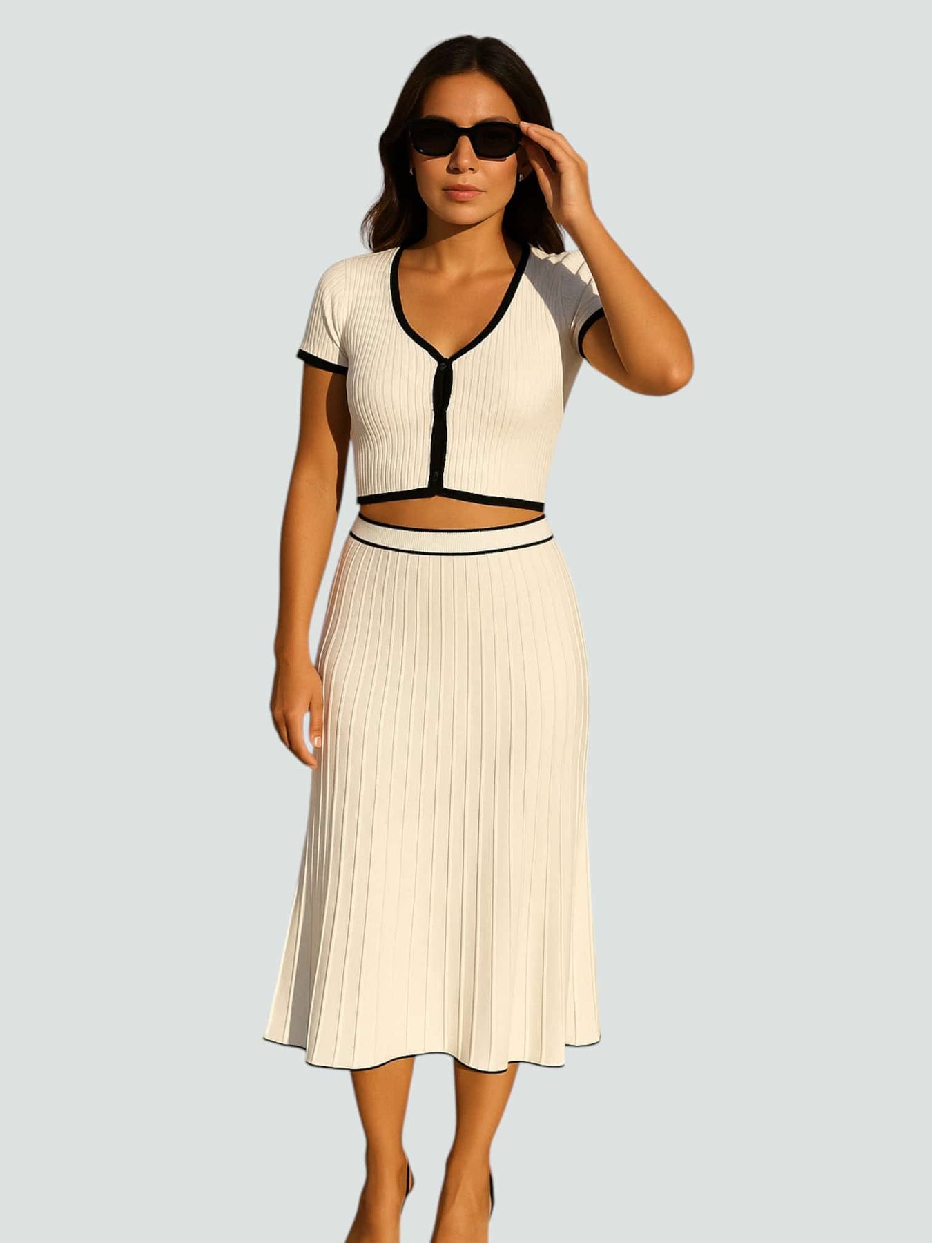 Un conjunto moderno con toques retro. El top ajustado y corto se combina con una falda plisada de vuelo suave para crear una silueta femenina y favorecedora. Los bordes en contraste aportan un aire gráfico y sofisticado.