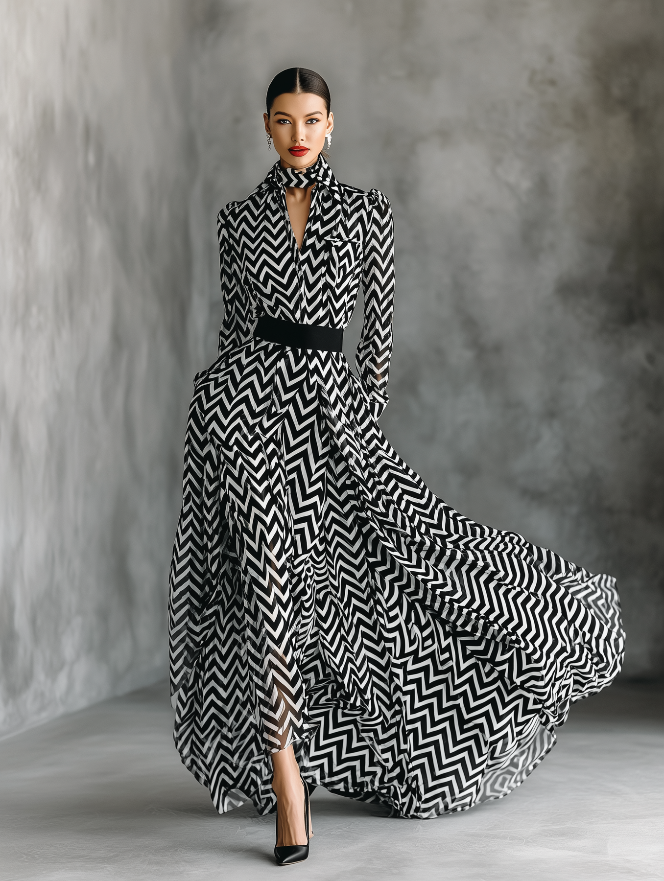 This flowing chiffon dress features a bold herringbone pattern with a cinched waist and tie-up neck detail. The soft fabric and full skirt create elegant movement.