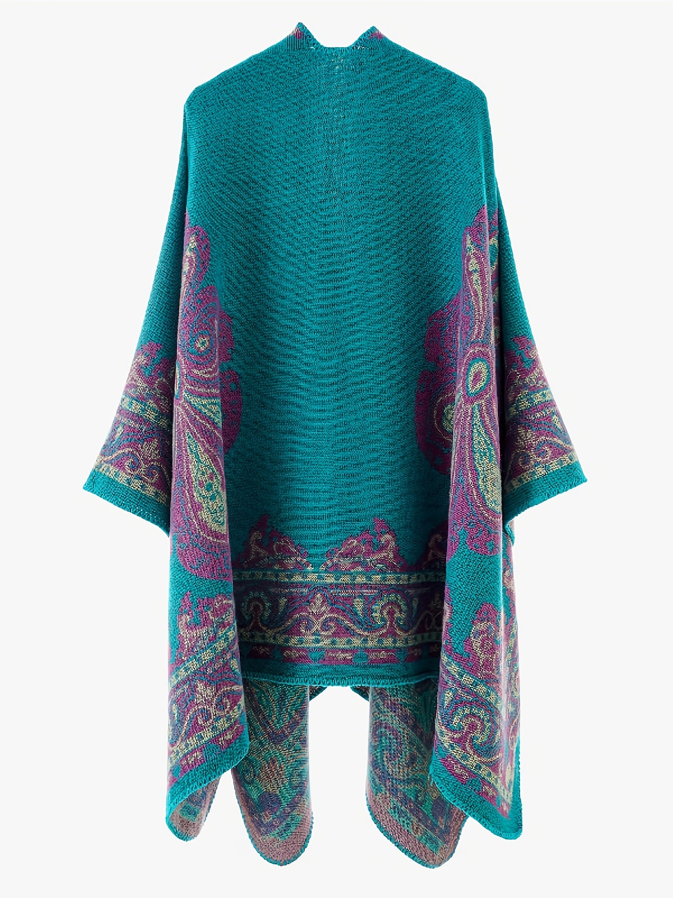 Women's Elegant Scottish Paisley Print Wrap Shawl Coat - Asymmetrical Long Sleeve All-Season Outerwear, Green & Brown Tartan Pattern, Versatile Travel & Formal Attire, Hand Washable Luxury Wrap Dress Accessory, Paisley Design with Green, Brown, and Golden